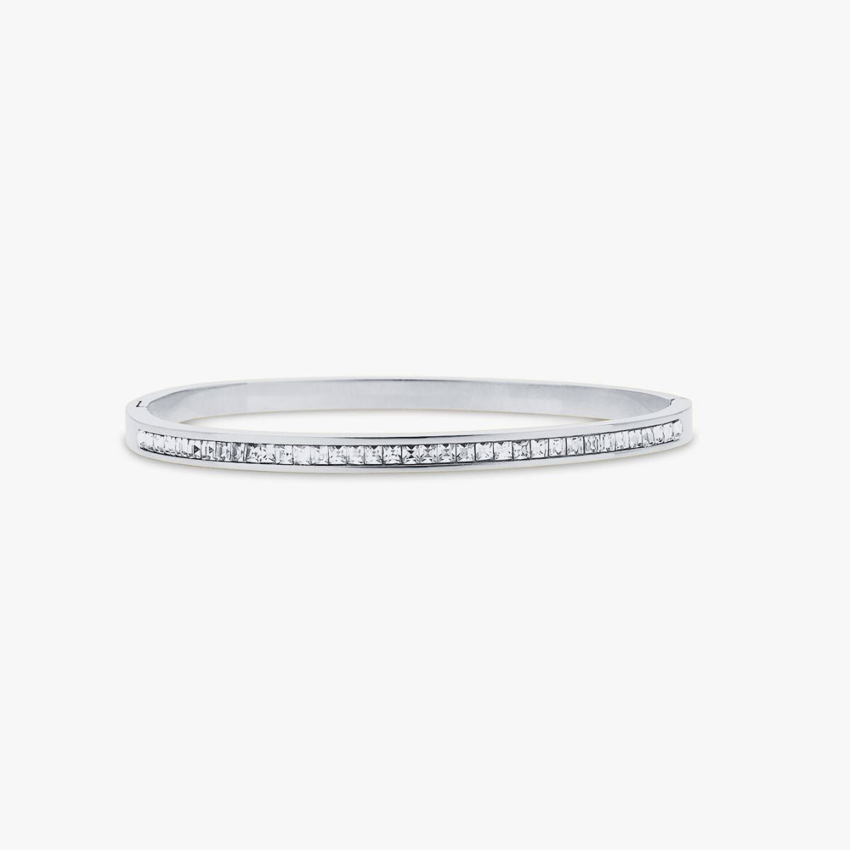 A sophisticated bangle set with a row of sparkling baguette and princess-cut Cubic Zirconia crystals, creating an exclusive and timeless expression. Elegant worn on its own, or layered with other bracelets for a refined, luxurious stack.