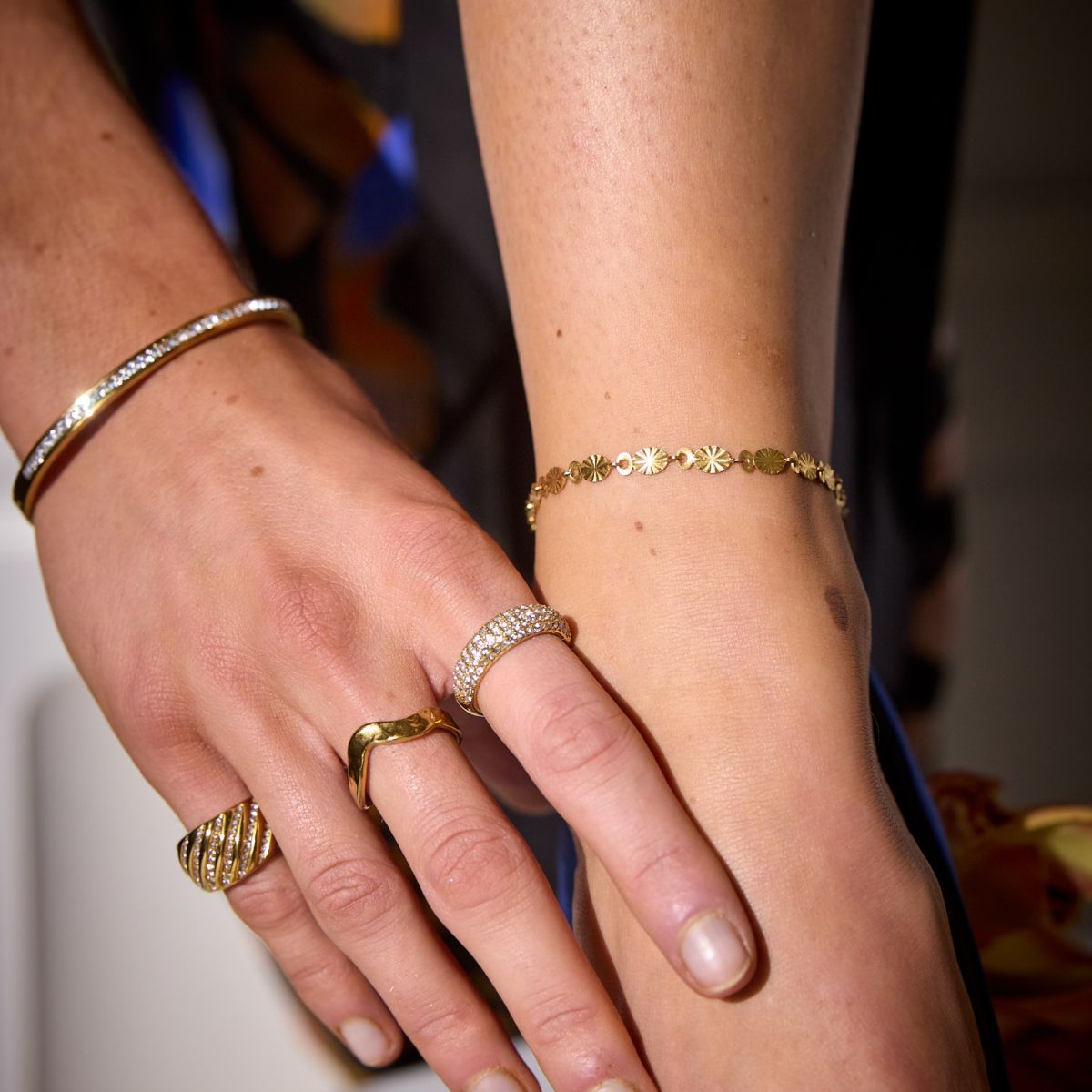 To preserve the radiance of the pavé stones, we recommend handling the ring with care. While the finish will not lose its color, prolonged exposure to large amounts of water may affect the adhesive securing the stones, as cubic zirconia is set using a strong bonding technique.