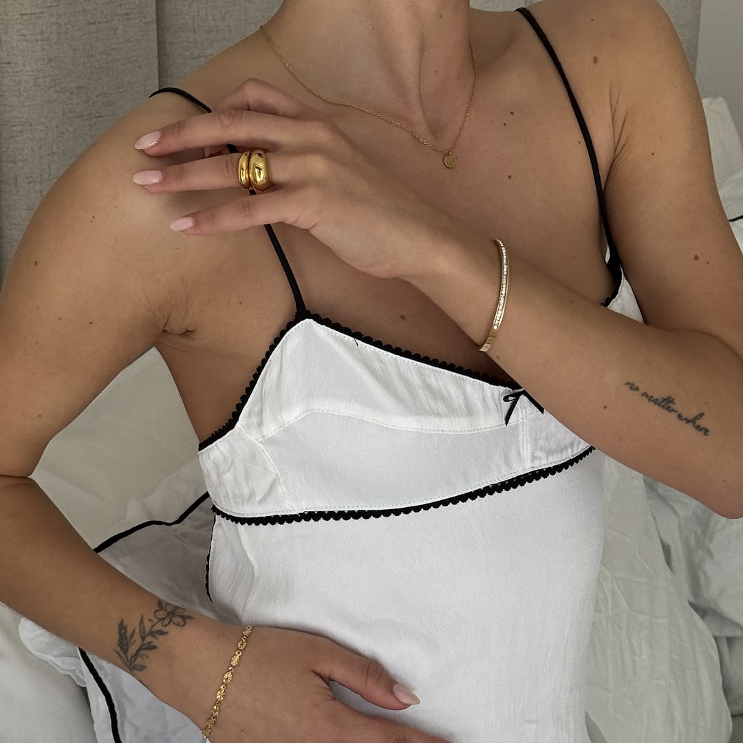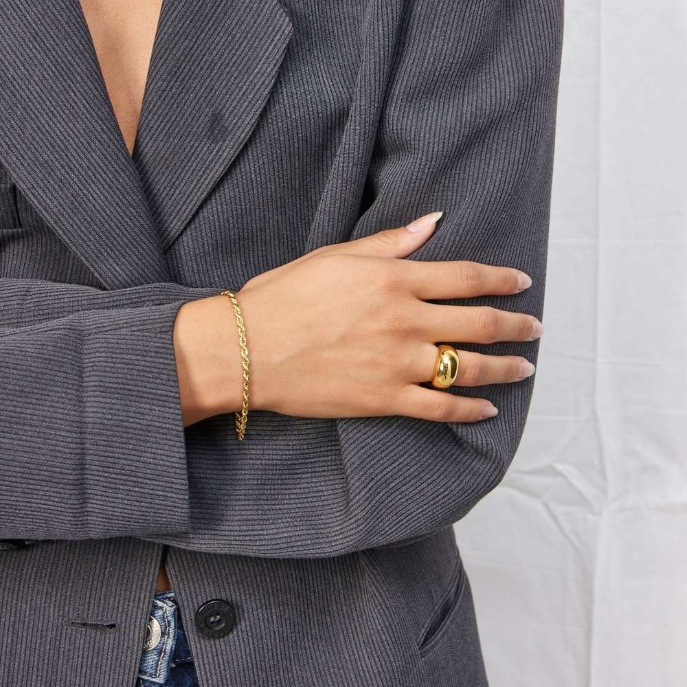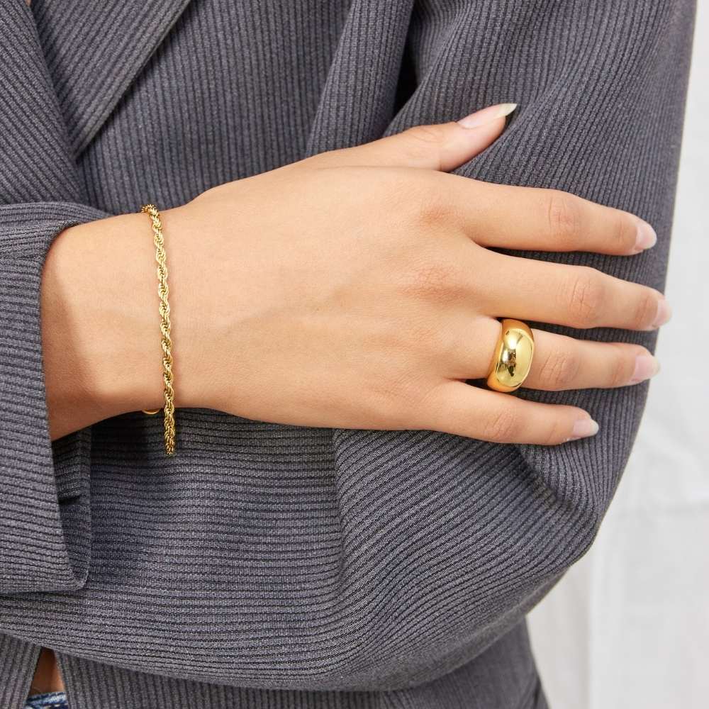 A bold yet refined ring defined by its wide, sculpted dome shape and mirror-polished finish. The clean, minimal design allows the material to take center stage, creating a luxurious and timeless expression.