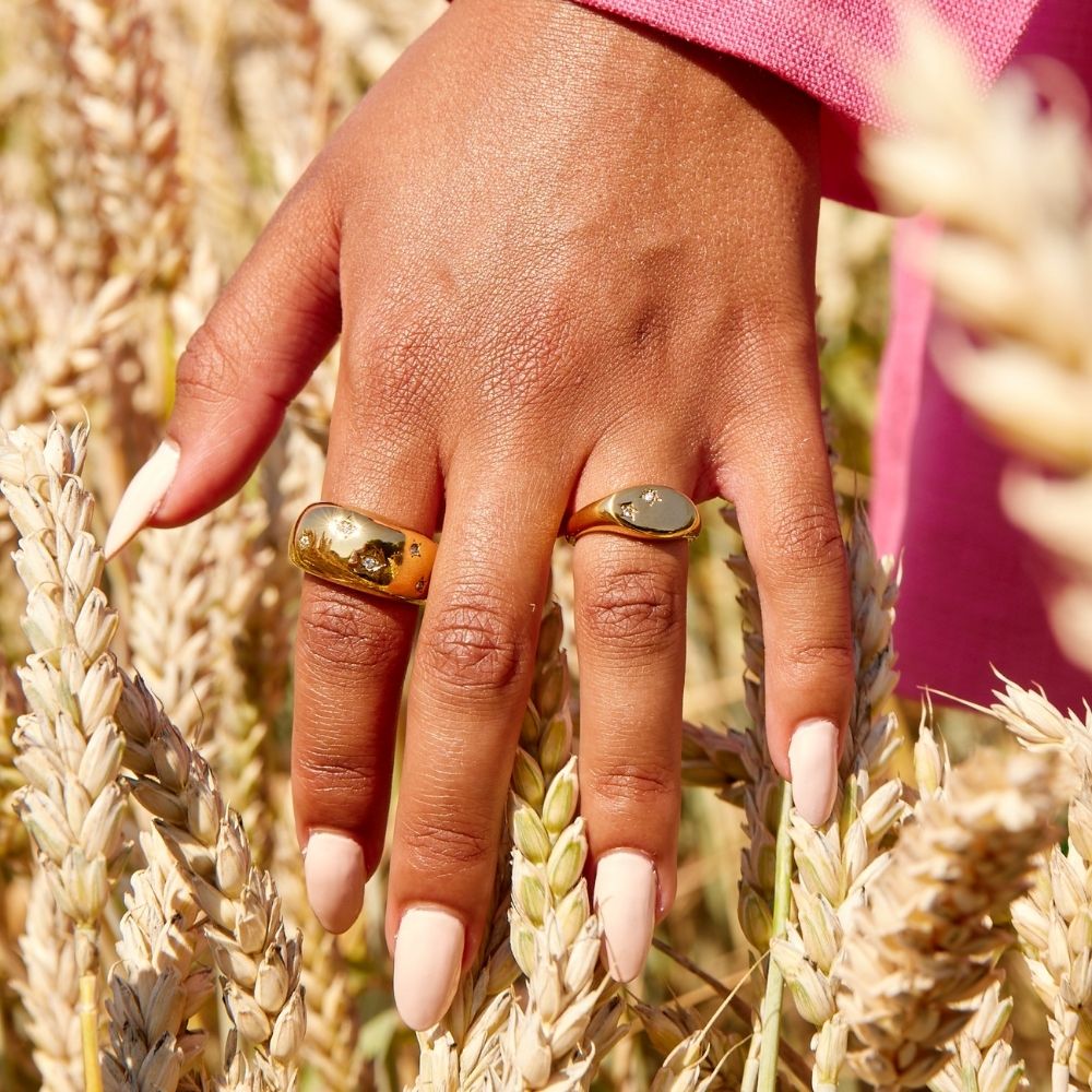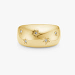 A bold dome ring that balances strength and femininity through a sculptural silhouette. Five hand-drawn stars, set with clear, luminous stones in varying sizes, are delicately offset across the surface, creating a playful yet refined sense of movement.