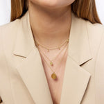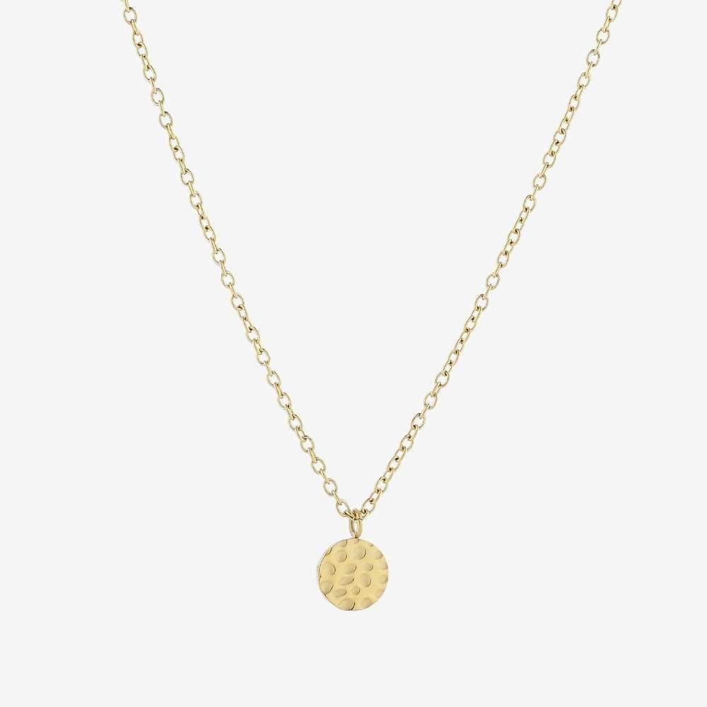 An elegant necklace featuring a simple, round pendant with a hammered finish. The minimalist design makes it ideal for both everyday wear and special occasions. The fine chain adds a light, feminine touch, creating a timeless piece that layers beautifully with other jewelry.