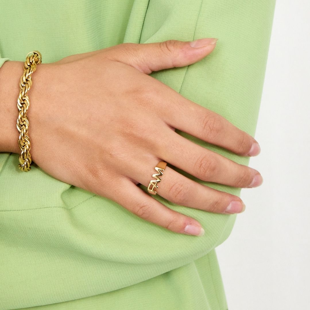 A refined signet ring engraved with FAM, offering a feminine and romantic expression with modern edge. Often worn on the index finger for a confident, contemporary look, it brings subtle meaning and style to everyday wear.