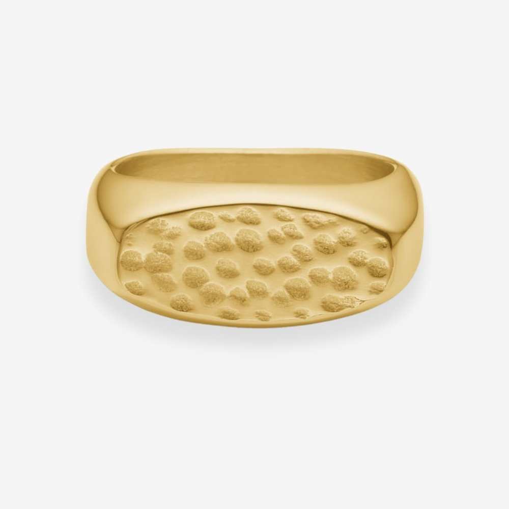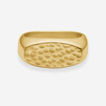 The Hammered Oval Signet Ring features a flat surface with a distinctive hammered finish. The textured front adds depth and character without making the ring feel heavy. Its broad silhouette creates a modern, confident look while remaining comfortable to wear. A refined design that balances strength and elegance in a single statement piece.