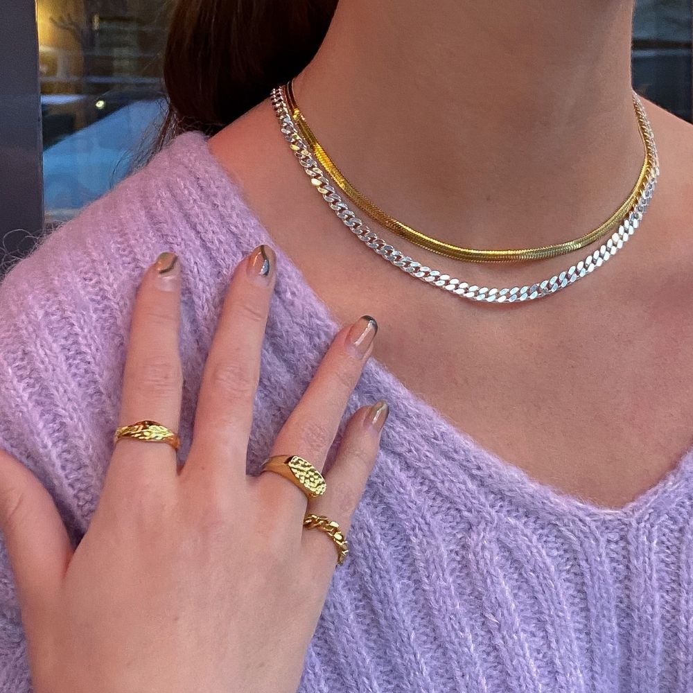 Material: Stainless steel plated with 18K gold. Nickel-free and lead-free for comfortable everyday wear. To preserve the beauty and longevity of your jewelry, we recommend avoiding contact with hard surfaces. The ring measures approximately 0.59" in width.