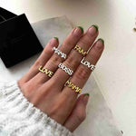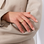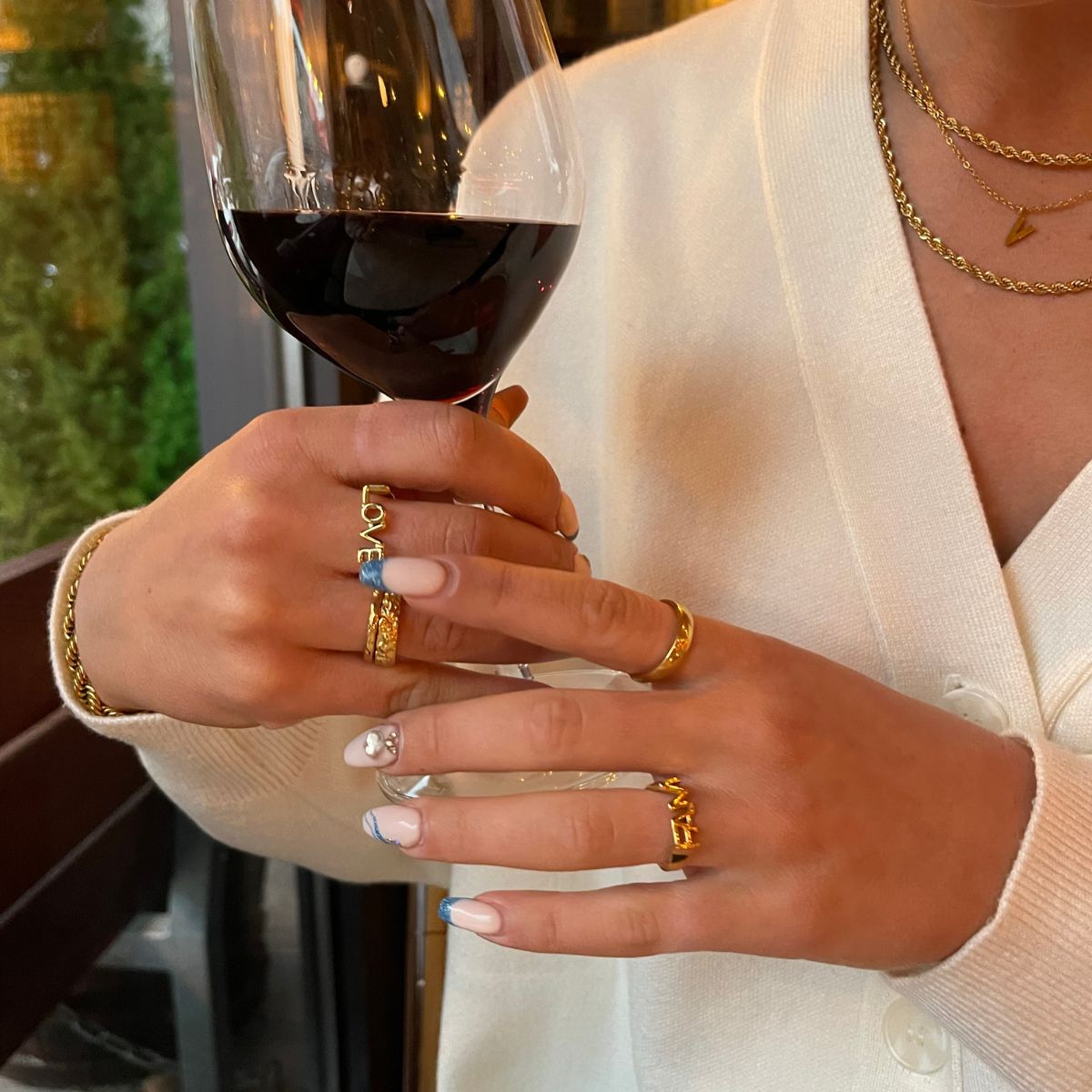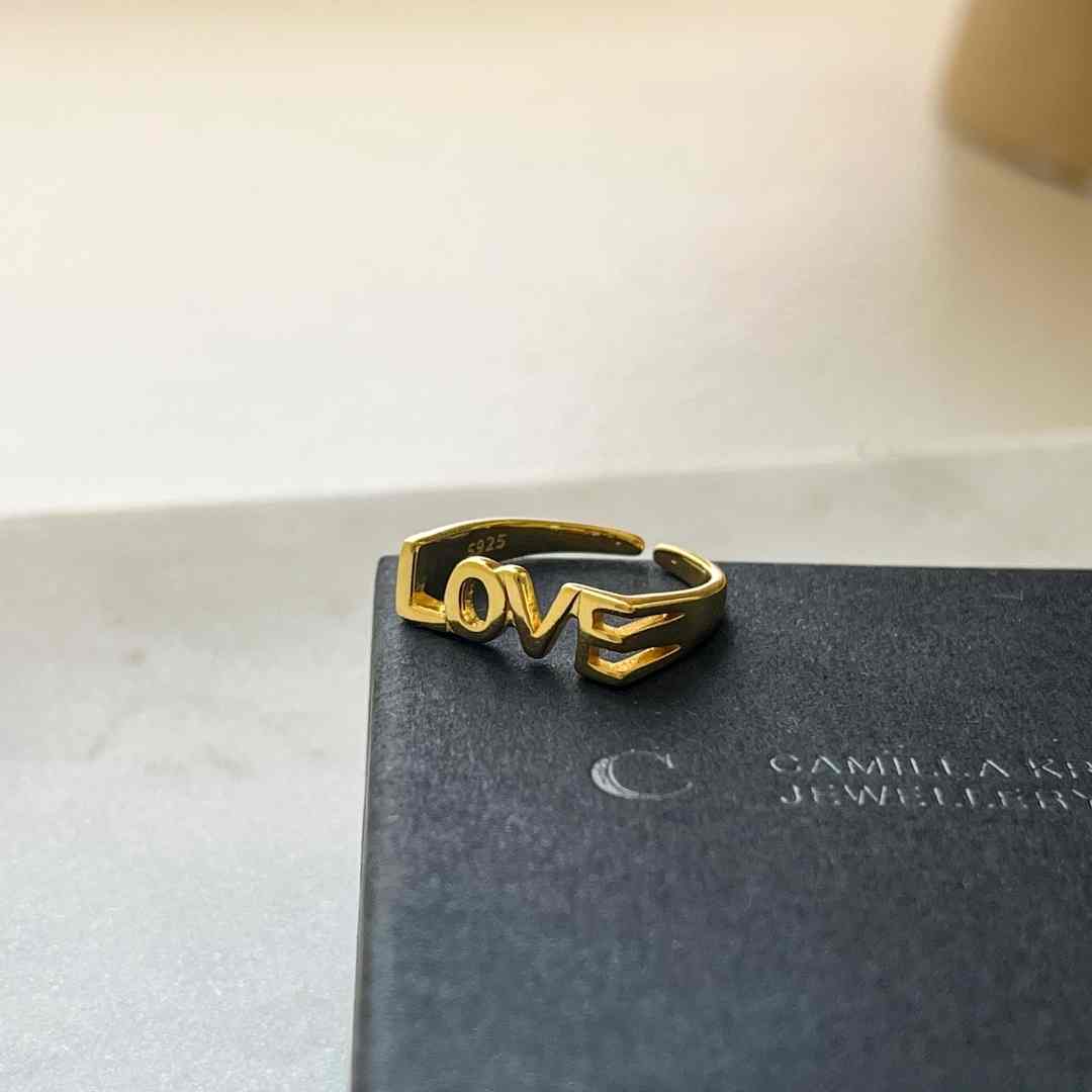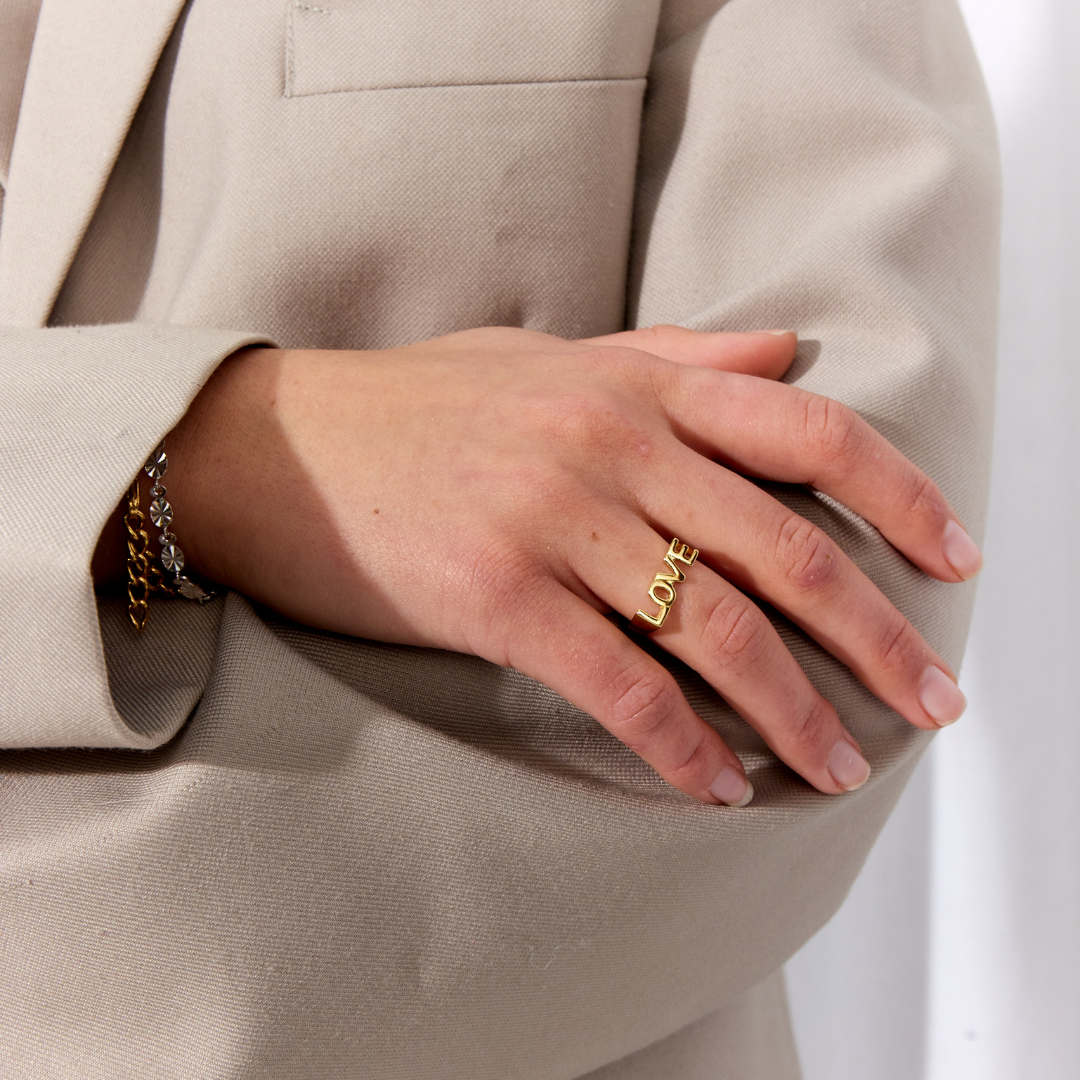 A feminine yet raw signet ring engraved with the word LOVE. Often worn on the index finger for a cool, confident look. Style it with classic bands or pair it with chunky rings to create a more bold expression—depending on your mood and style.