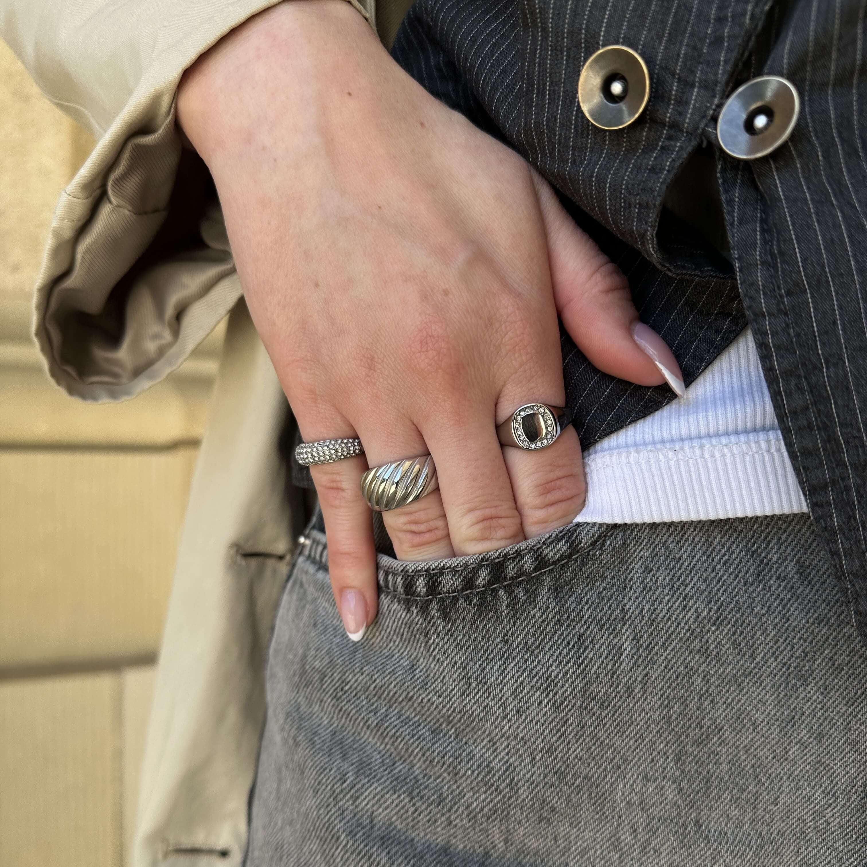 Crystal Letter Square Signet Ring, 925 Silver