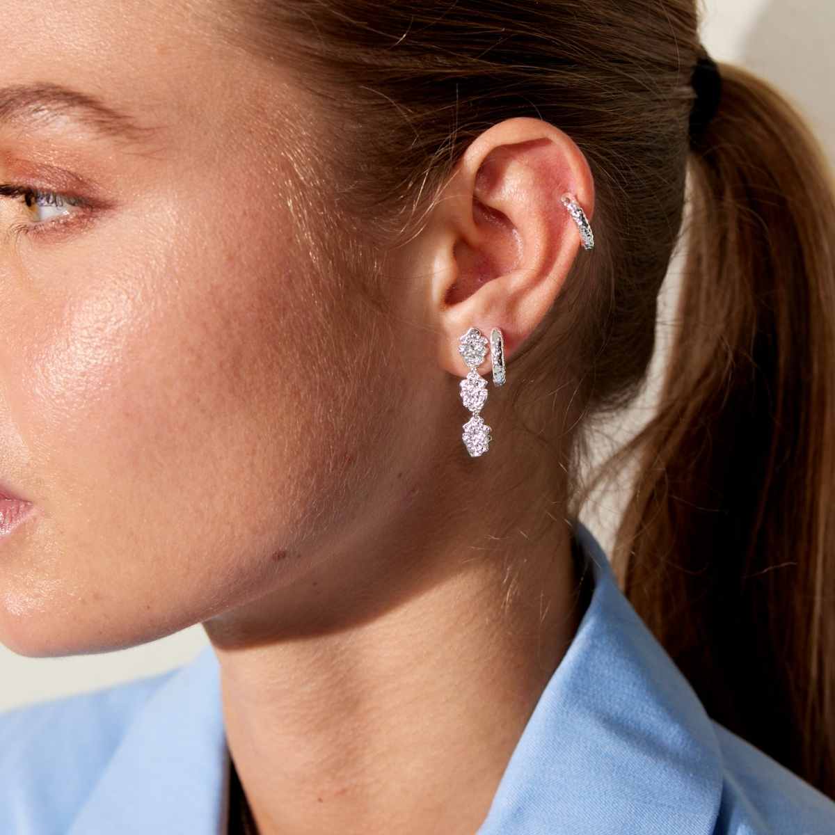 Iconic textured earrings designed in beautifully asymmetrical lengths, creating a refined yet striking expression. The sculptural surface catches the light with subtle brilliance, adding depth and character while maintaining an elegant, modern silhouette.