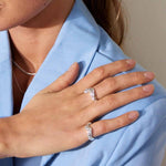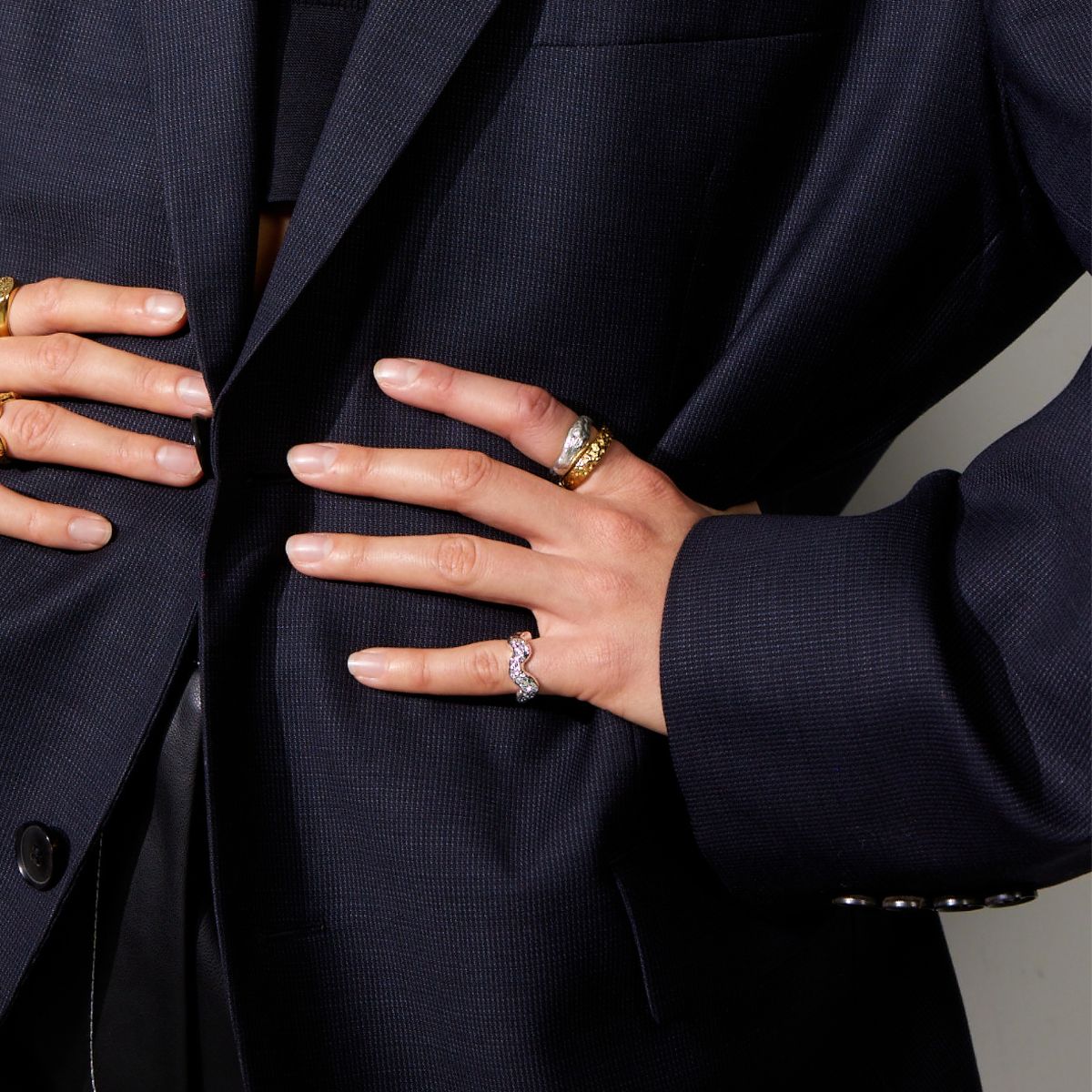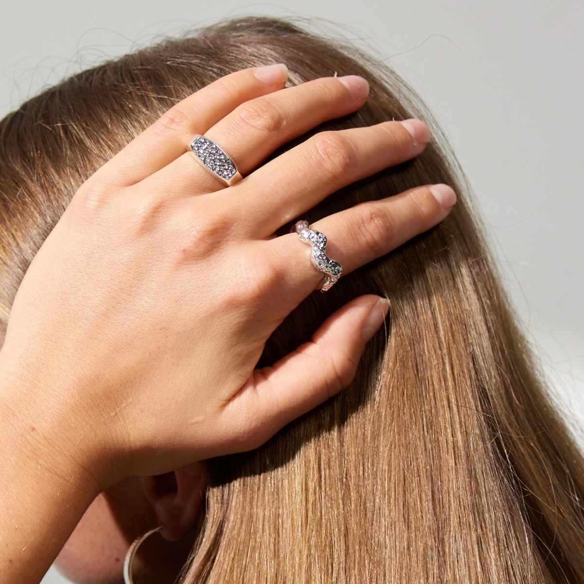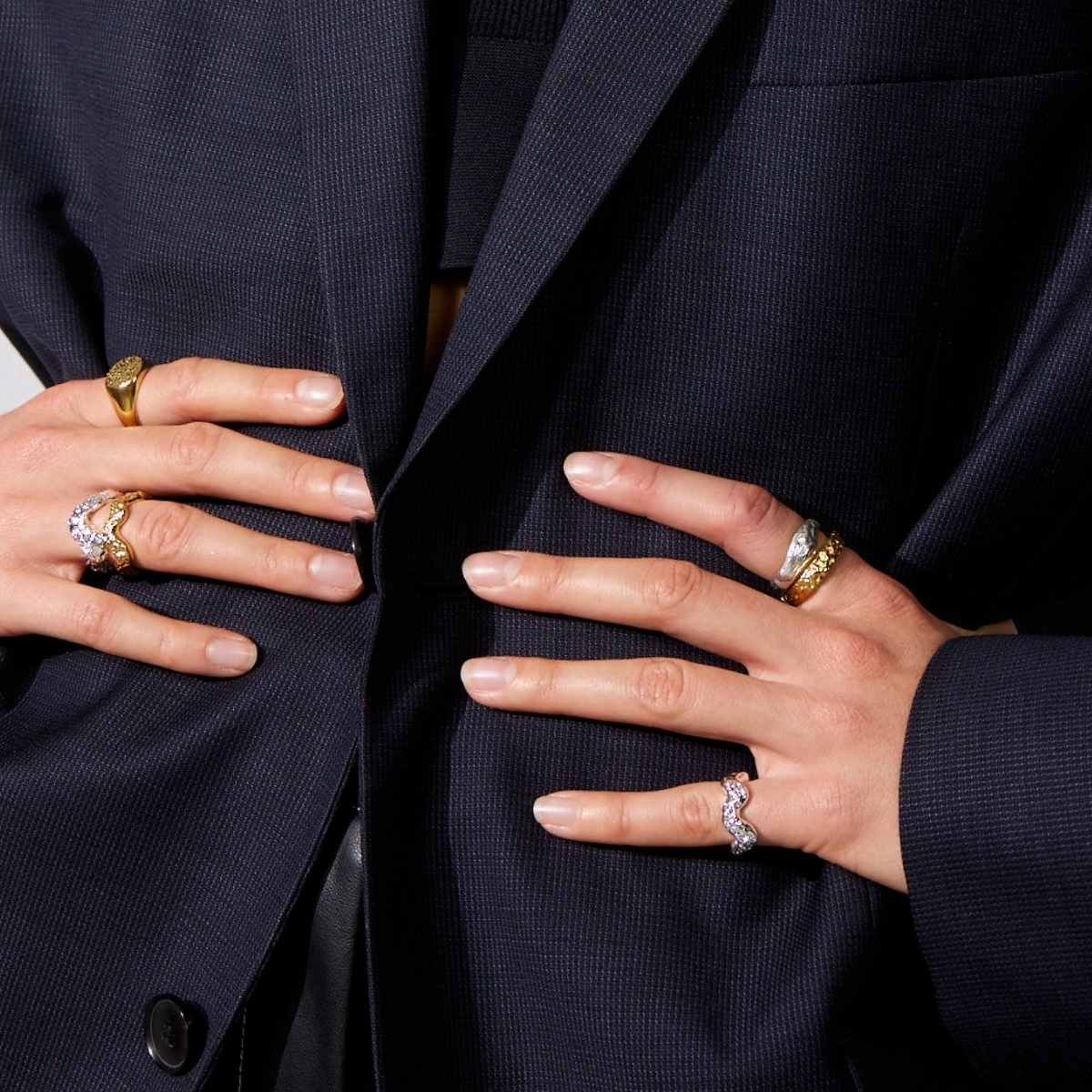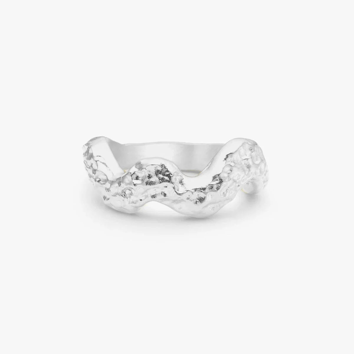 A distinctive ring with a raw, textured surface that makes a bold statement through its sculptural shape and detailed finish. Stack two together for a chunky look, or let a single ring speak on its own.