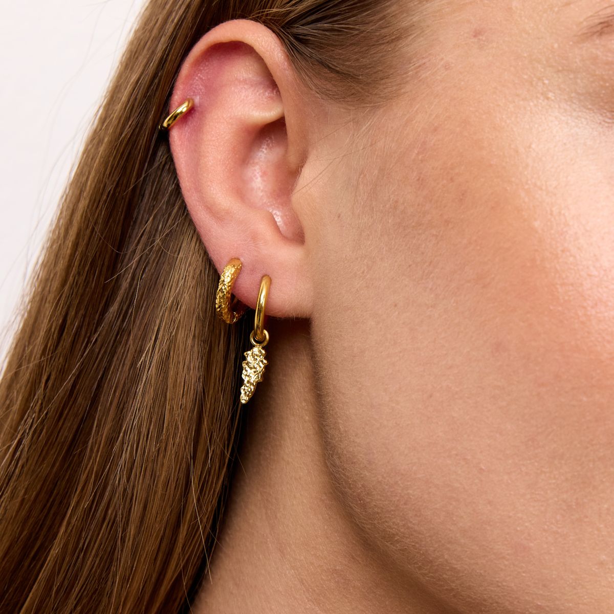 A must-have pair of textured hoop earrings designed for effortless ear stacking. Defined by a subtle, raw surface, they offer a modern yet minimalist expression that blends seamlessly with any ear styling.