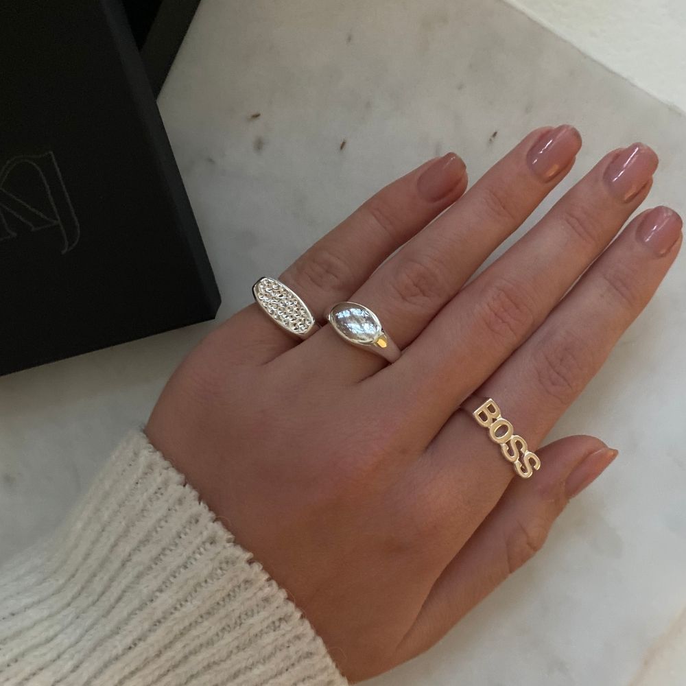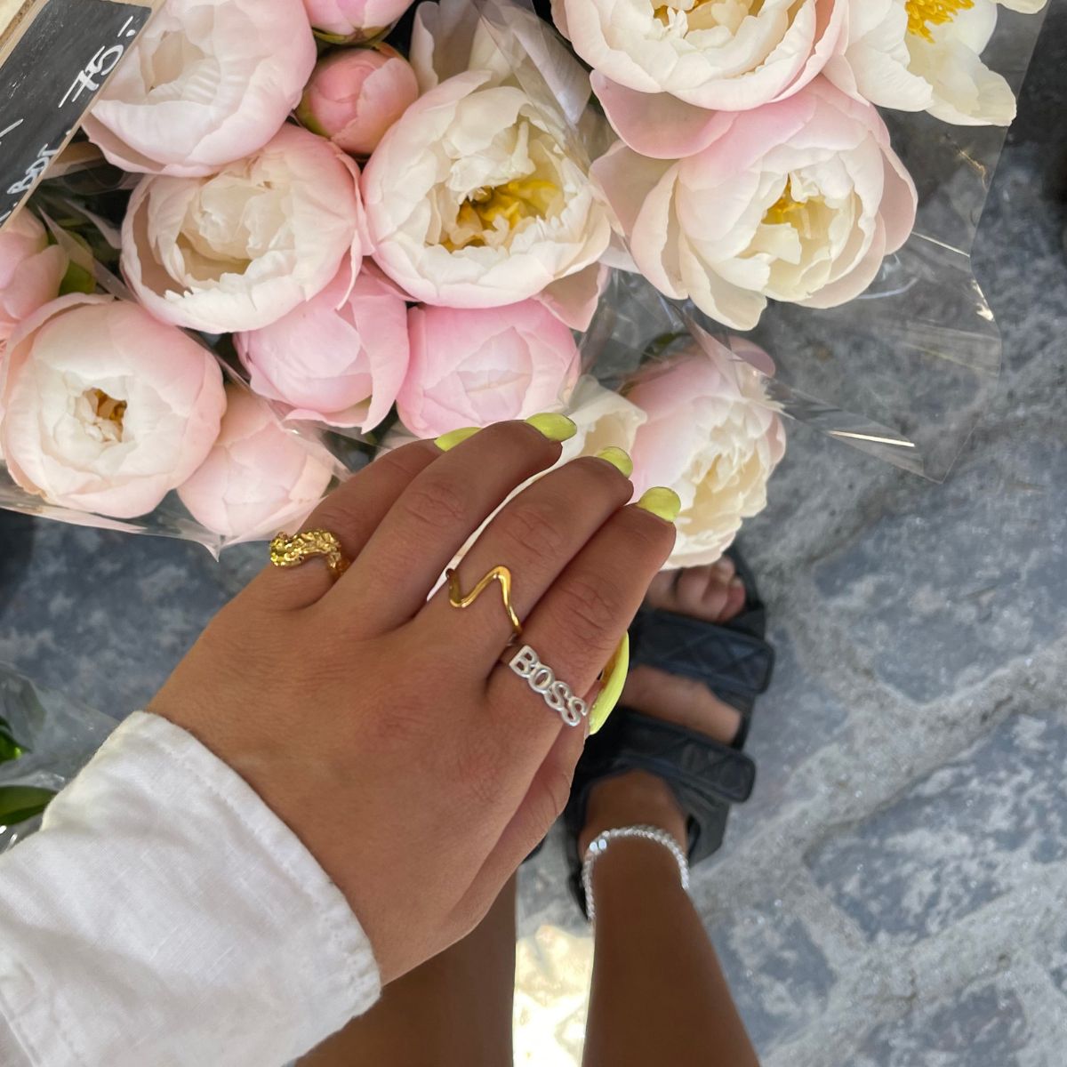 A bold yet feminine signet ring engraved with BOSS, designed to make a confident statement. Often worn on the index finger for a cool, empowered look—whether you know a BOSS or you are one, this ring is made to reflect strength and attitude with effortless style.
